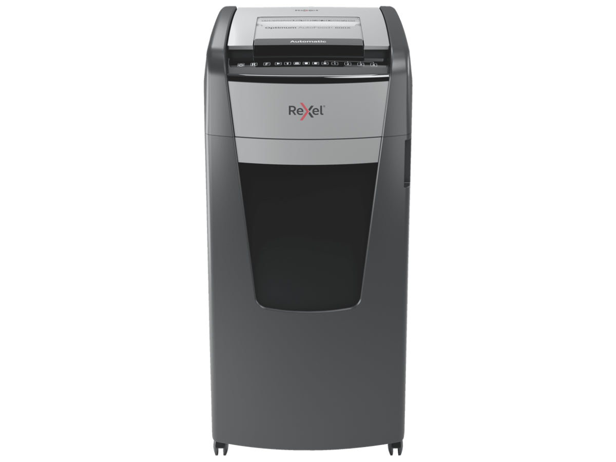 The Optimum AutoFeed+ 600X cross cut shredder automatically shreds up to 600x A4 sheets of paper (80gsm) at a time, into P-4 (4x36mm) cross cut pieces. This auto feed shredder machine is a sophisticated office shredder, featuring a 110L pull out bin. No need to manually feed paper, or remove staples and paper clips first, this automatic paper shredder will do all the work for you.